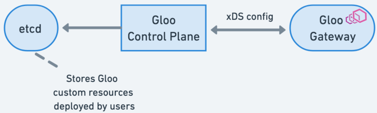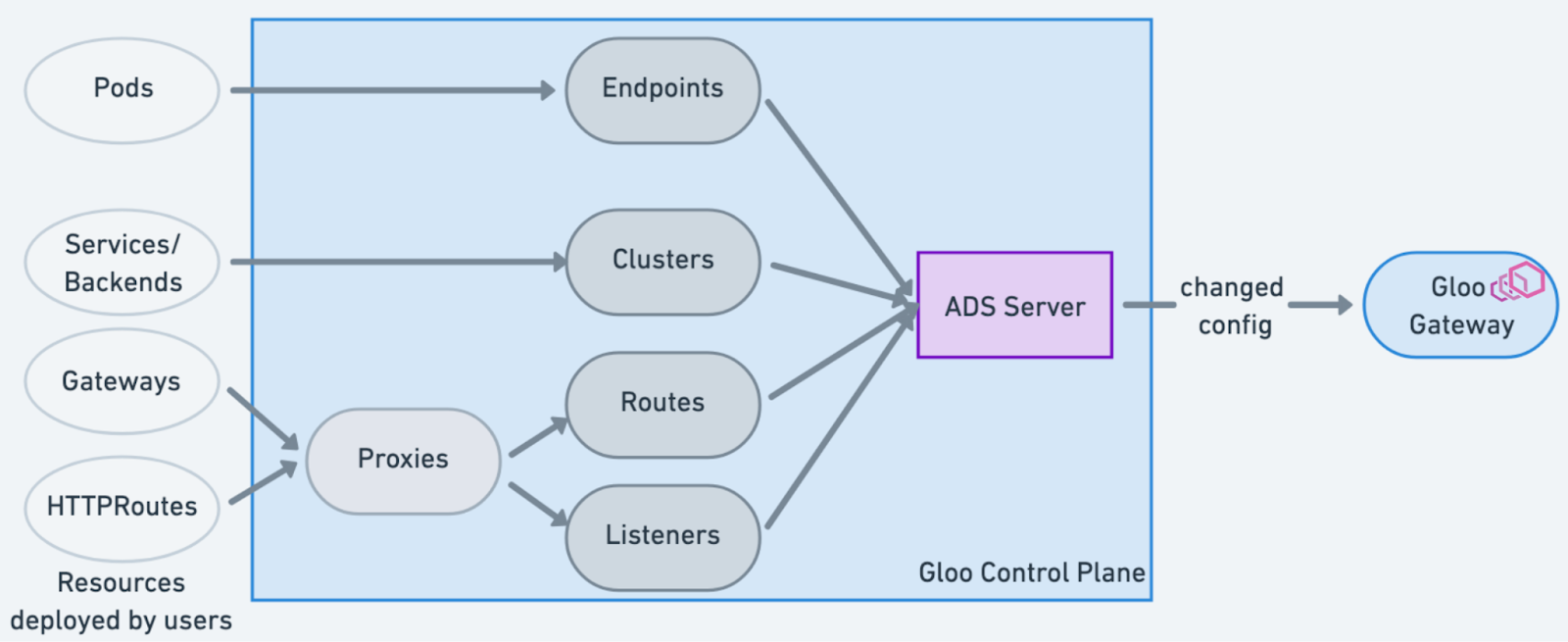When we designed Gloo, we structured it with two types of pods: Gloo and Gateway. The Gloo pod served as the control plane, while the Gateway pod ran as a programmed Envoy proxy based on user’s declarative intention via Gloo custom resources. To support multiple APIs, we introduced an intermediate Proxy custom resource (CR), which was responsible for translating various user’s declarative intentions into Envoy’s xDS representation to program the Gateway pod.